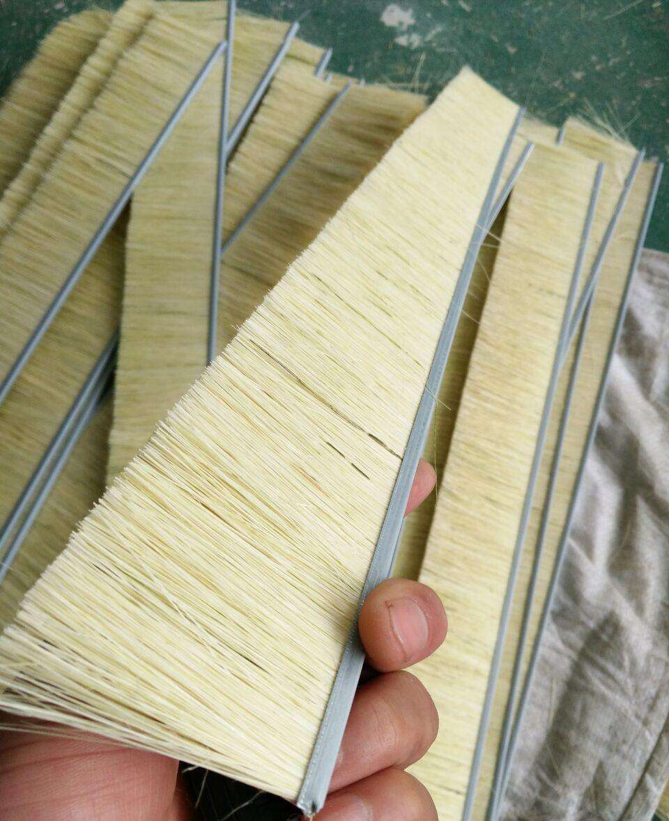 劍麻毛刷條:采用鋼帶夾住劍麻,中間用鐵絲壓住固定。刷毛緊固,不脫毛,鋼帶的厚度最小達2.5mm*2.5mm最大14mm*14mm單根長度不限。毛長按需定制。