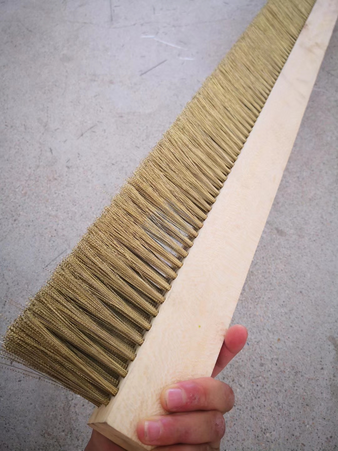 木條刷采用結(jié)實硬木,加工成所需要的方塊,再鉆孔植毛。可使用尼龍絲、鋼絲、銅絲、不銹鋼絲、磨料絲、豬鬃、馬尾、劍麻等進行植毛。